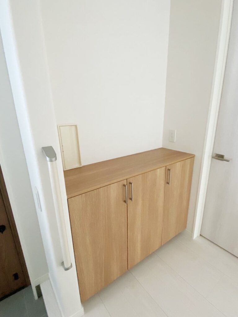 左側の玄関ドアから死角になる位置にはロータイプの収納を配置しました。